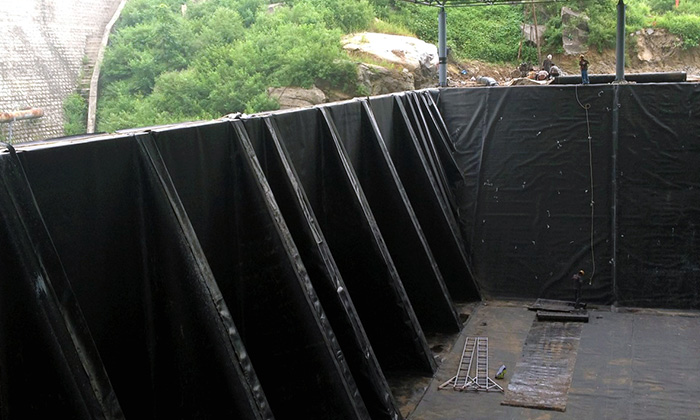 本工程總面積約15,400㎡。防滲材料采用剛性防滲與柔性防滲相結合的防滲結構,剛性結構采用1,000mm厚鋼筋混凝土,柔性防滲層選用5,000g/㎡膨潤土墊,5mm土工復合排水網和雙層HDPE土工膜(底層為1.5mm,上層為2.0mm),膨潤土墊下鋪1,000mm鋼筋混凝土層作為剛性防滲層,兩層HOPE土工膜中間設置5mm土工復合排水網,上層HDPE膜上鋪一層600g/m2無紡士工布作為保護層;
