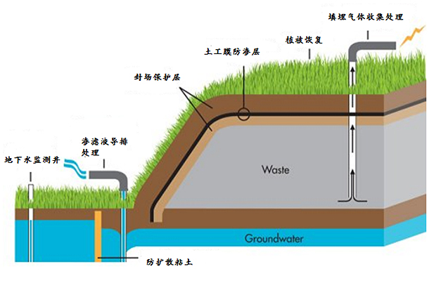 填埋場封場技術是指通過工程手段,將不再使用的固廢填埋場隔離成一個封閉獨立的單元,外界雨水和地下水不再進入堆體,堆體內產生的廢水和廢氣等污染物進行有序導排和處理,使填埋場不再污染周邊環境。