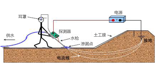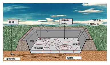 在雙電極土工電學滲漏破損探測方法中,將不同電勢施加到土工膜(泥土或水)上面及其下面。覆蓋土工膜的泥土或水的電勢場相對均勻。土工膜為一種極其有效的絕緣體,在存在孔洞時電場導通,通過移動測量儀探測導通位置,精確定位產生滲漏孔洞的點。